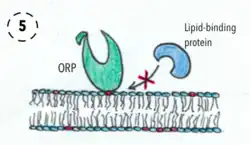 4-The access of other lipid-binding proteins to the membrane is regulated by ORPs in two ways. One way is by presenting a lipid to a second lipid-binding protein. (5)Another way is preventing the lipid-binding protein from accessing a lipid in the membrane. This two mechanisms are not mutually exclusive so ORPs might use both.