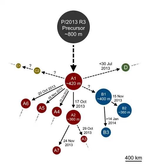 When P/2013 R3 was discovered, it had already fragmented into two distinct co-moving components,[1] named P/2013 R3-A and P/2013 R3-B.[7]: 8  High-resolution observations by the 10-m Keck Telescope at Mauna Kea Observatory and the 10.4-m Gran Telescopio Canarias at Roque de los Muchachos Observatory in October 2013 revealed two more new fragments, named C and D, that had presumably split off from the main component A.[15][3]: 1  Even higher-resolution observations by the Hubble Space Telescope starting in October 2013 revealed that component A was composed of many more smaller fragments, with component C having already split and component B later ejecting small fragments. Hubble observations continued until February 2014, when P/2013 R3 became unobservable as it entered conjunction with the Sun.[5]: 13