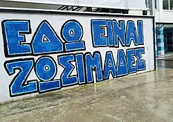 A graffiti outside of the stadium saying "Here is Zosimades" (Εδώ είναι Ζωσιμάδες)