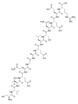 PEPITEM (Peptide Inhibitor of Trans-Endothelial Migration) is an endogenous polypeptide composed of the 14 amino acids 28–41 of the 14.3.3.ζδ protein, which in turn is a 245 amino-acid product of the YWHAZ gene. It has the sequence SVTEQGAELSNEER. PEPITEM has antiinflammatory effects by inhibiting trafficking of T cells into inflamed tissues. Levels of PEPITEM in the body decline with age, diabetes or rheumatoid arthritis, and decreased PEPITEM levels correlates with increases in chronic inflammation and numerous resulting health issues. Administration of synthetic PEPITEM has been suggested as a treatment for various conditions where inflammation plays a role.[1][2][3][4][5][6][7][8]