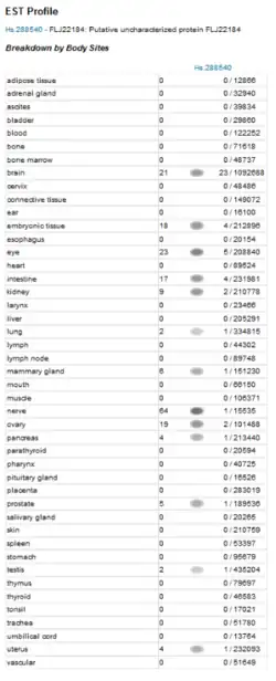 - ^ "FLJ22184 - Normal tissues of various types". GEO Profiles. National Center for Biotechnology Information. Retrieved 1 May 2015.