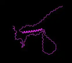 The secondary structure is characterized by high confidence in the presence of an alpha helix from amino acid 43 to 70 with the rest consisting of coils.[18] In terms of tertiary structure, predictive tools returned low confidence in all sections of the protein besides the core alpha helix.[19]
