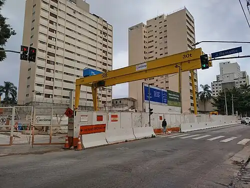 The construction of the station began in 2016, when the opening date was estimated to mid-2020.[2] Later, Governor Geraldo Alckmin promised the opening of the first phase of the line to 2020, time which was discarded due to a year of delay in the financing of the Federal Savings Bank, which would be used for the expropriations. In June 2016, the opening of the line was estimated for 2021,[3] time kept in October 2017, when the resume of the construction was announced for the beginning of 2018.[4][5][6] Currently, the construction is suspended, due to the involvement of the construction companies of the Move São Paulo consortium (Odebrecht, Queiroz Galvão, UTC Participações) in Operation Car Wash, which caused them to not get the financing of R$ 5.5 billions (US$ 1,575,344,427.58) with the Brazilian Development Bank (BNDES) for the continuity of the construction. The State Government of São Paulo is currently in negotiations with international companies, including Spanish Acciona[7] and Chinese China Railway Construction Corporation.[8]