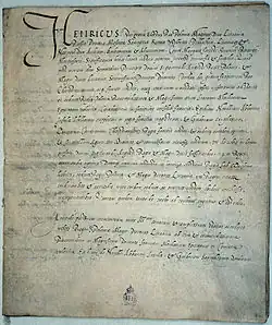 The document was drawn up by the convocation sejm, which elected the King.[3] The pacta conventa affirmed the king-elect's pledge to respect the laws of the Commonwealth and specified policies to be enacted in foreign policy, state finances, the armed forces, public works and other areas.[2] An example of the various concrete undertakings found in a king-elect's pacta conventa is King Władysław IV Vasa's pledge to create a Polish–Lithuanian Commonwealth Navy for the Baltic Sea. Each King's pacta conventa was different based on the specific policies he had promised in order to be elected, making it somewhat similar to a modern political platform or manifesto.