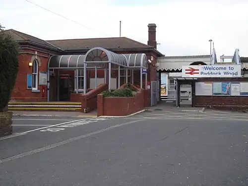 The South Eastern Railway opened a line from Redhill to Ashford and on to Dover during 1842.[1] This bypassed the county town of Maidstone, and a station named Maidstone Road was opened in a rural location on 31 August 1842 to serve the town, 8 miles (13 km) to the north.[2] The village of Paddock Wood developed quickly around the station, which took the name Paddock Wood on 25 September 1844 when the branch line to Maidstone West was opened.[1][3] Another branch line—the Hawkhurst Branch—to the village of Hawkhurst existed between 1892 and 1961.[4]