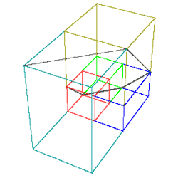 The first cuboid is 1x1x1. The second is formed by adding to this a 1x1x1 cuboid to form a 1x1x2 cuboid. To this is added a 1x1x2 cuboid to form a 1x2x2 cuboid. This pattern continues, forming in succession a 2x2x3 cuboid, a 2x3x4 cuboid etc.[1][2][3] Joining the diagonals of the exposed end of each new added cuboid creates a spiral (seen as the black line in the figure). The points on this spiral all lie in the same plane.[1]