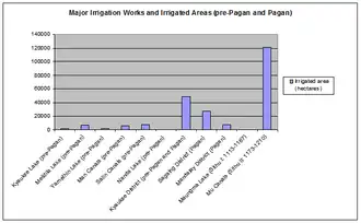 Anawrahta proved an energetic king. His acts as king were to strengthen his kingdom's economic base. In the first decade of his reign, he invested much effort into turning the arid parched lands of central Myanmar into a rice granary, successfully building/enlarging weirs and canals, mainly around the Kyaukse district,[36] east of Pagan. The newly irrigated regions attracted people, giving him an increased manpower base. He graded every town and village according to the levy it could raise. The region, known as Ledwin (လယ်တွင်း, lit. "rice country"), became the granary, the economic key of the north country. History shows that one who gained control of Kyaukse became kingmaker in Upper Myanmar.[33]
