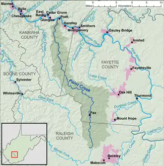 Paint Creek is a 42.1-mile (67.8 km)[3] tributary of the Kanawha River in southern West Virginia. Paint Creek is part of the Mississippi River watershed via the Kanawha and Ohio Rivers and drains an area of 123 square miles (320 km2).[4]