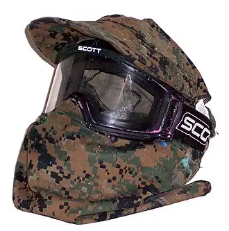 Sometimes called "goggles", masks are safety devices that players are required to wear. These completely cover the eyes, mouth, ears and nostrils of a person. Some masks even feature throat guards. The lenses are designed to protect against paintballs traveling up to 90 m/s (300 ft/s), but are not guaranteed to withstand impacts at greater speeds.