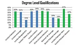 Pakistani men are better qualified than the average Londoner,[7] with 37% possessing a degree level or higher qualification, although Pakistani women have fewer educational qualifications, with 27% having the same qualifications. The figure for Pakistani women in London is still higher than the national or British Pakistani national average.[15]