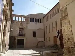 Due to the family's financial issues, the Crown seized the property and auctioned the town and the barony of Albaida. Cardinal Lluís Joan del Milà, nephew of Pope Callixtus III and first cousin of the future Pope Alexander VI, was the purchaser. His son, Jaume del Milà married Elionor d'Aragó, niece of the king Ferdinand II of Aragon, the Catholic, and first cousin of the emperor Charles V, Holy Roman Emperor. This meant that the title of count was conferred on those who owned the territory and resulted in a union between the two families, Milà and Aragó (1477).[4] In 1477 the cardinal of Milà took up residence in the properties he had acquired in 1471, first in Albaida and then in Carrícola. In the document in which he transferred the barony of Albaida to his son, he makes known in writing the fortalitio dominali hospitio of the town, that is the fortress or stately home, which corresponds to the initial phase of the current palace.[5] This early palace had an L-shaped plan, an attached patio, a fortified access and the large west tower. Furthermore, the palace strengthened the most vulnerable part of the city's enclosure because it was built on the wall and next to the new entrance to the town (constructed in 1460). Between 1525 and 1550, a new wing was built that enclosed the palace courtyard and made a quadrangular building with a centralized plan, like so many other Valencian Gothic palaces. The palace courtyard was paved with river stones and had a well in the middle, a porch with pillars and above it a gallery or balcony surrounding the main floor was located. This reform is recognizable by the beam configuration and Renaissance plasterwork. Also, two fortification towers, the eastern tower and the one in the middle, were integrated into the building wall. The result of this work was that the building's orientation was redirected to the main square. These modifications transformed the building from a military fortification into a palace. Balconies were open on the main floor, weakening the military defence provided by the wall and a gallery of Roman arches was built too.