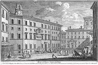The ancient institution of the Monte di Pietà of Rome, founded in 1527 and approved in 1539 by Paul III with the bull "Ad Sacram Beati Petri Sedem," had its headquarters from the very early seventeenth century in the palace formerly belonging to the Petrignani family of Amelia, which still houses it. During the pontificate of Benedict XIV (1740-1758), the institute became the bank of the State of the Church, assuming first, in 1743, the functions of Secret Treasury and General Depositary of the Reverend Apostolic Camera (previously contracted out to private bankers) and then, from 1749, of Papal Mint. In view of the new space requirements generated by these changes, the Monte di Pietà turned to the search for a location for its new offices, opting in 1759 to purchase from the Discalced Carmelites the old Casa Grande dei Barberini, bordering its palace. To provide a safe passage between the two buildings, the street that separated them was bypassed with an arch, built in the following decade, and from it took the name Via dell'Arco del Monte. The Casa Grande, enlarged in the direction of the arch, was destined to be the headquarters of the General Depositary of the Apostolic Camera, the Depositary Bank and the archives of the Monte di Pietà:[2] the atrium and staircase designed by Giansimoni in the new wing date to these years (1759-1764).[19] From this time until the Capture of Rome, the Casa Grande Barberini remained the property of the Monte di Pietà: among the transformations in the building's decorative apparatus, the three mounts that replaced the Barberini coats of arms in many of the stucco cornices inside[20] bear witness to this phase. In 1819 the twelve black granite columns of Contini's atrium were removed and replaced by travertine columns to adorn the New Wing of the Vatican Museums.[2]