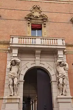 Construction of the palace was commissioned in 1638 by Camillo Bargellini of a Bolognese Senatorial family. The architect was Bartolomeo Provaglia, and building was directed by Antonio Uri. A notable feature of the palace entrance are the two flanking telamons, locally called giganti or giants. These were sculpted in 1658 by Gabriele Brunelli and Francesco Agnesini. The scenic entrance stairwell was designed in 1730 by Carlo Francesco Dotti and Alfonso Torregiani.[2]