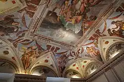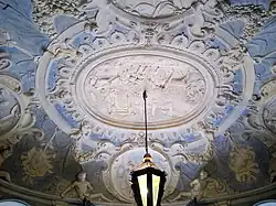 The oldest pictorial work in the palace is the cycle of frescoes painted in 1623–1624 by the Genoese painter Bernardo Strozzi and later concealed due to a quarrel with the client Luigi Centurione, who had purchased the palace in 1609 from Nicolosio Lomellino. Documents, which still exist today, relating to the dispute between the artist and Centurione (1625), confirm the painter's work in three rooms on the first piano nobile, the frescoes of which were concealed by later interventions with a thick layer of plaster and a false ceiling in the central hall. Removed in 2002, the Allegory of Faith.[4] reappeared underneath it. The fresco shows a rowing lifeboat from which a woman representing the Christian faith is helped to land on dry land to bring the faith to the natives of the New World, depicted in the surrounding lunettes together with exotic animals. Also on board the lifeboat are two sailors and the four evangelists, recognisable as each of them holds a book. The Faith, supported by angels, is instead identified by the chalice and the cross, while the nobleman with the sword, assumed to be Christopher Columbus, who was friendly with the Centurione Scotto family.[5] Columbus' exploits were a frequent subject in the decoration of Genoese palaces, already featured in the central hall of palazzo Belimbau frescoed by Tavarone. In the other two rooms, in a more precarious condition, the Astrology and fragments with Navigation and Tritons were found.[6] This fresco, unfinished, now offers the rare opportunity to observe the squaring and preparatory drawing done with black chalk.