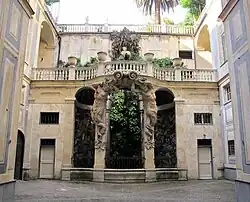 The open courtyard is bordered on the sides by the rear wings of the palazzo, while the terraces overlook a grandiose nymphaeum built in the 18th century to a design by Domenico Parodi. The nymphaeum, which harmoniously blends architectural, natural and sculptural elements, is heir to a particularly flourishing tradition in Genoa, which already had illustrious examples in the Villa Pallavicino delle Peschiere, in the villa of the Prince, and in the nearby palazzi di Pantaleo Spinola and Balbi Senarega. Here the architect-sculptor Parodi devised a monumental and unprecedented solution, exploiting the copious waters of Castelletto to connect the courtyard with the garden two levels higher up, entrusting the stucco sculptures of the gigantic tritons and the putto throwing water to his pupil Biggi, while the group of Phaeton falling from the sky placed in the centre of the grotto and crumbled over the centuries by the water is lost.[3] A garden opens towards the mountain, erected by exploiting the slope of the hill behind.