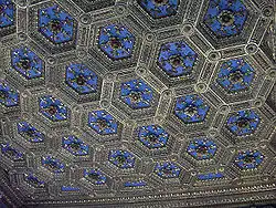 The carved coffer ceiling, laminated with pure gold, is by Giuliano da Maiano (1470–1476). On the portal to the Chapel of the Signoria is an inscription in honor of Christ (1529). The doorway to the Hall of Lilies has marble mouldings sculpted by the brothers Giuliano and Benedetto da Maiano. The inlaid woodwork (intarsia) on the doors was carved by Del Francione and depicts portraits of Dante and Petrarch.