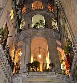 The Palazzo D'Afflitto is a palace located in the San Giuseppe neighbourhood of Naples, Italy, adjacent to the Palazzo Capomazza di Campolattaro. It used to belong to the princely family d'Afflitto. In the third floor is the recently restored Church of the Real Monte Manso di Scala, built atop the famed Cappella Sansevero. The palace was built in the 15th century but underwent numerous reconstructions. [1]