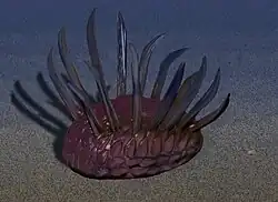 A giant, 10 centimetres (3.9 in) long arrow worm. It has the distinction of having 50 spines around its mouth. As with modern arrow worms, the spines were used to grasp prey for consumption. C. praetermissus is thought to represent a stage of chaetognathan evolution before arrow worms became planktonic swimmers. | ![]() |