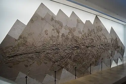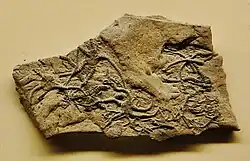 The Sachrang Formation or "Posidonienschiefer" Formation (common name the "Posidonia Shale") is a geological formation of southwestern Germany, northern Switzerland, northwestern Austria, southeast Luxembourg and the Netherlands, that spans about 3 million years during the Early Jurassic period (early Toarcian stage). It is known for its detailed fossils, especially marine biota, listed below.[1] Composed mostly of black shale, the formation is a Lagerstätte, where fossils show exceptional preservation (including exquisite soft tissues), with a thickness that varies from about 1 m to about 40 m on the Rhine level, being on the main quarry at Holzmaden between 5 and 14 m.[1] Some of the preserved material has been transformed into the fossil hydrocarbon jet which, especially jet derived from wood remains, is used for jewelry.[2] The exceptional preservation seen in the Posidonia Shale has been studied since the late 1800s, finding that a cocktail of chemical and environmental factors led to such an impressive preservation of the marine fauna.[2] The most common theory is that changes in the oxygen level, where the different anoxic events of the Toarcian left oxygen-depleted bottom waters, stopped scavengers from consuming the dead bodies.[3]