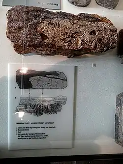 - SMNS 81841 (Stenopterygius quadriscissus) represents one of the clearest examples of deadfall communities described in the formation: the skeleton is associated with serpulids surrounded by a mass of disarticulated ophiuroid remains, indeterminate echinoid tests, an isolated crinoid ossicle, the byssate bivalve Oxytoma inaequivalvis, the pectinid Propeamussium pumilus, Eopecten strionatis, Plagiostoma sp., Meleagrinella sp., "Cucullaea" muensteri, with the genera Parainoceramya dubia and Liostrea associated with the carcass.[23] As many of these bivalves show overgrowth the community likely persisted for some time.[23] Fossil traces of Gastrochaenolites isp. attributed to mechanical bivalve borers are abundant implicating prolonged exposure of the skeleton on the seafloor.[23]