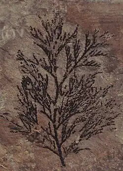 Probably related with archaeal activity.[26] Although Frutexites is a cryptic microfossil and an important element of many deep water stromatolites, with an inorganic origin proposed it was interpreted as dendritic shrubs of purely inorganic growth of aragonitic crystals, but it also resembles shrubs of the cyanobacteria Angulocellularia.[26] In the Posidonia Shale a cryptoendopelitic mode of life is assumed, being only possible for heterotrophic bacteria or fungi.[26] As seen in the stromatolites of the Posidonia Shale, Frutexites acted mainly as a dweller or secondary binder of the deep-water stromatolites, not as their major constructor.[26] |