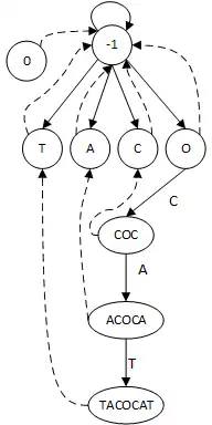 Palindrome Tree example for TACOCAT, where solid lines are character edges and dashed lines are suffix edges