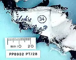 Further examination of the clothing believed to have been in the bomb suitcase found fragments of paper (from a booklet on the Toshiba RT-SF 16 Bombeat radio cassette player) embedded into two Slalom-brand men's shirts, a blue baby's jumpsuit of the Babygro Primark brand, and a pair of tartan trousers. Fragments of plastic consistent with the material used on a Bombeat and pieces of loudspeaker mesh, were found embedded in other clothing which appeared to have been inside the bomb suitcase: a white, Abanderado-brand T-shirt; cream-coloured pyjamas; a fragment of a knitted, brown, woollen cardigan with the label "Puccini design"; a herringbone jacket; and brown herringbone material, some of which bore a label indicating it came from a pair of size-34 Yorkie-brand men's trousers.