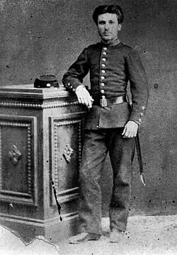 Danglis enrolled in the Army Academy at a crucial juncture: the institution had been badly neglected in the previous years, and only 13 students were attending it when Danglis entered it. His class of 31 cadets, and the reform of its curriculum by the then Minister for Military Affairs, Lt. Colonel Charalambos Zymvrakakis, breathed new life into it.[13] Danglis was a distinguished student. He graduated to the second and third years in third place (only 17 of his class graduated to the second year), and received his first promotion, to Corporal, in 1872. He then scored first in his class during all subsequent the exams, except for scoring second during the general theoretical exams between the fifth and sixth classes. Promoted to Sergeant Major in 1874, he and his classmates of the senior year began enjoying the social life of Athens. Danglis graduated from the Academy in August 1877 top of his class, and was commissioned as Ensign of Artillery, like most of his colleagues. The artillery, recently enlarged due to a possible Greek participation in the ongoing Russo-Turkish War of 1877–78, was facing extreme shortages in qualified officers at the time.[14]