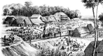 Before the railroad construction could get fully started, the island was connected to the Panamanian mainland by a causeway supported by pile-driven timbers. The first rolling stock, consisting of a steam locomotive built by William Sellers & Co.,[14] and several gondola cars, arrived in February 1851. The required steam locomotives, railroad cars, ties, rails, and other equipment were unloaded at the newly constructed docks and driven across the track laid across the about 200-yard (180 m) causeway separating the island from the mainland. This causeway connected the Atlantic terminus to the railroad and allowed the ties, iron rails, steam engines, workers, backfill, and other construction material to be hauled onto the mainland. Later, passengers and freight would go the same way. As the railroad progressed, more of the island was filled in, and the causeway was expanded to permanently connect the island to the mainland; its island status disappeared and the town of Aspinwall was created.[15]