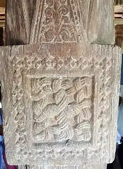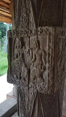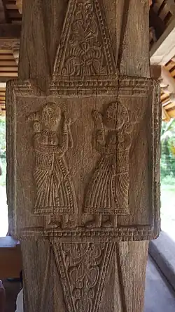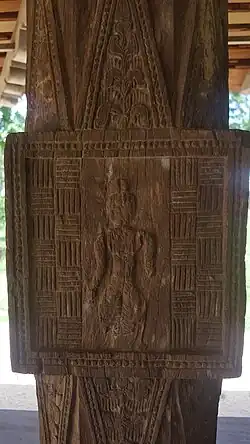 The body of the posts is carved in an octagonal shape with a square panel at the middle of each post. Each of the square panels of all the 9 inner posts is decorated with elaborate carvings. There are 36 such panel carvings. Additionally, the pillar heads (connecting the posts to the roof), beams, rafters, and reepers are also richly carved.[9]