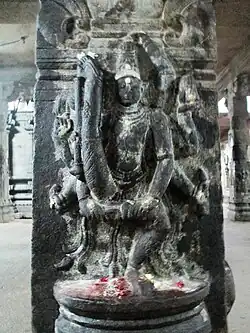 Panchavarnaswamy temple complex has three prakarams (outer courtyard) and a five-tiered rajagopuram (gateway tower). The central shrine faces east and holds the image of Panchavarnaswamy (Shiva) in the form of lingam made of granite. The granite images of the deities Ganesha (son of Shiva and god of wisdom), Murugan (son of Shiva and god of war), Nandi (the bull and transport of Shiva) and Navagraha (nine planetary deities) are located in the hall leading to the sanctum. As in other Shiva temples of Tamil Nadu, the first precinct or the walls around the sanctum of Panchavarnaswamy has images of Dakshinamurthy (Shiva as the Teacher), Durga (warrior-goddess) and Chandikeswarar (a saint and devotee of Shiva). The second precinct is surrounded by granite walls.[3]