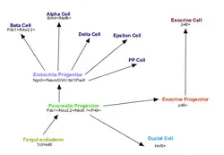 Endocrine progenitor cells develop from Pancreatic Progenitor cells under the influence of Ngn3 (neurogenin 3). This cell fate commitment is due to the expression of Sox9 (Sry-related HMB box transcription factor 9) and suppression of Notch signaling. Pancreatic Progenitor cells are hence Ngn3+/NeuroD+/IA1+/Isl1+/Pax6+ cells. These cells then develop into Beta cell pro-precursors under the influence of Pax4. Beta cell pro-precursors are MafB+/Pdx1+/Nkx2.2+ cells. These beta cell pro-precursors are determined to form beta cell precursors expressing Pax1.[23] Finally, beta-cell precursors mature into mature adult beta cells which are Pdx1+/Nkx2.2+/Nkx6.1+/Pax6+/NeuroD+/MafA+.[24]