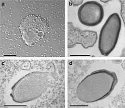 The discovery of Pandoraviruses by a team of French scientists, led by husband and wife Jean-Michel Claverie and Chantal Abergel, was announced in a report in the journal Science in July 2013.[5] Other scientists had previously observed the pandoravirus particles, but owing to their enormous size they were not expected to be viruses.[5] Patrick Scheid, a parasitologist from the Central Institute of the Bundeswehr Medical Service in Koblenz, Germany, found one in 2008, in an amoeba living in the contact lens of a woman with keratitis. Its development within the amoebal host was documented extensively. Unlike in other cases with such giant viruses, the large particles within Acanthamoeba were not mistaken for bacteria. The authors initially termed them "endocytobionts".[8]