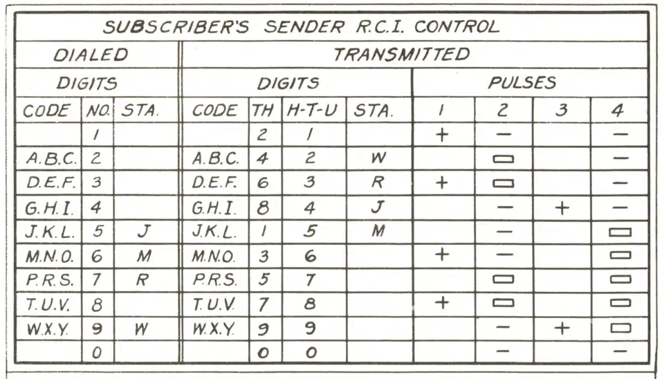 In the below table, + represents a positive pulse, - represents a light negative pulse, and ▭ represents a heavy negative pulse. Note that the thousands digit (as transmitted) is coded differently than the hundreds, tens, and units digits.