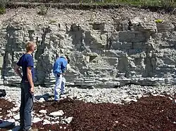 Geologists studying the Jaani Formation (Silurian, Wenlock) at Panga Cliff, Estonia.