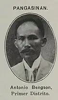 | 4 | Modesto Sison | October 16, 1916 | June 3, 1919 | 4th | Progresista | Elected in 1916. | 1916–1922 Agno, Aguilar, Alaminos, Anda, Balincaguin, Bani, Bolinao, Burgos, Dasol, Infanta, Labrador, Lingayen, Salasa, Sual | ||