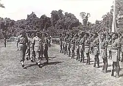 The planned expansion of the PIB proceeded as scheduled, with the second and third companies forming in 1941.[18] In May, the establishment of the battalion had been increased, and in April Logan requested another 100 men from the government. B Company was formed from a nucleus of 62 recruits which arrived from Buna on 12 May under the command of Captain Ernest Standfield, a former planter.[9][19] While the chief argument for the formation of the battalion had been the value of the knowledge native soldiers would provide of local conditions, with the expansion of the unit many of the officers and NCOs posted into it were from Australian infantry, engineer and artillery units based in Port Moresby, rather than local expatriates. Indeed, with the main role of the unit envisioned to be scouting and reconnaissance—tasks in which it was felt the natural bushcraft of the natives could be utilised to their greatest potential—the drawbacks of junior leaders without local experience was apparent.[18] The terms of service of the new recruits included enlistment for three years, with pay at a rate of 10 shillings per month for the first year, 15 in the second, and one pound in the third, with lance corporals paid 25 shillings, corporals 30 shillings, and sergeants 40 shillings. Equipment provided included a waterproof cape, clasp knife and lanyard, two pairs of khaki shorts and shirts per year, two green sashes, sulus for working and sleeping, in addition to a mosquito net, blankets, plates and eating utensils, webbing, rifle, bayonet, and helmet. Rations were more generous than those given to the police, and included butter and jam.[9]