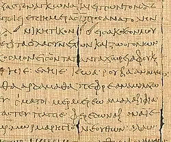 This manuscript contains the Tetragrammaton ιεωα (IEŌA) written in col. XV, line 10 (PGM VII:531) in the Victory Charm.[2] R. F. Hock transcribes and translates the text as follows: