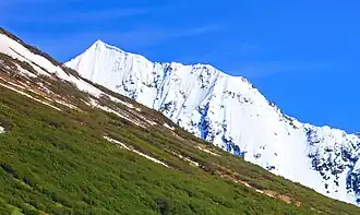 Paradise Peak is located 14 miles (23 km) northeast of Seward in the Kenai Mountains, on land managed by Chugach National Forest.[3] Precipitation runoff and glacial meltwater from the mountain's slopes drains to Kenai Lake via the Snow River. Although modest in elevation, topographic relief is significant as the summit rises over 4,800 feet (1,463 m) above Paradise Valley in 1.5 miles (2.4 km). The mountain is named in association with Paradise Valley which it borders, and the toponym was officially adopted in 1971 by the United States Board on Geographic Names.[4] The first ascent of the summit was made on June 29, 1969, by Grace Hoeman via the West Ridge.[6][7]