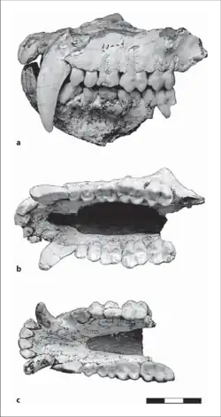 Paradolichopithecus is an extinct genus of cercopithecine monkey once found throughout Eurasia. The type species, P. arvernensis, was a very large monkey, comparable in size to a mandrill. The genus was most closely related to macaques, sharing a very similar cranial morphology.[1] The fossils attributed to Paradolichopithecus are known from the Early Pliocene to the Early Pleistocene of Europe (France, Spain, Greece, Romania, and Serbia) and Asia (Tajikistan and China).[2][3] The East Asian fossil genus Procynocephalus is considered by some to represent a senior synonym of Paradolichopithecus.[4]