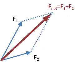 Suppose two forces act on a particle at the origin (the "tails" of the vectors) of Figure 1. Let the lengths of the vectors F1 and F2 represent the velocities the two forces could produce in the particle by acting for a given time, and let the direction of each represent the direction in which they act. Each force acts independently and will produce its particular velocity whether the other force acts or not. At the end of the given time, the particle has both velocities. By the above proof, they are equivalent to a single velocity, Fnet. By Newton's second law, this vector is also a measure of the force which would produce that velocity, thus the two forces are equivalent to a single force.[2]