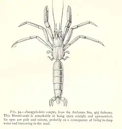 Parapylocheles scorpio is a species of hermit crab in the family Pylochelidae.[2] It lives at depths from 200 to 925 meters in the Indo-West Pacific, in Indonesia and the Philippines, although it may live in water as shallow as 100 meters, in wood fragments, tusk shells, and pieces of bamboo.[3] It is the only member of the genus Parapylocheles.