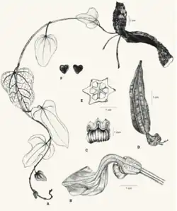 The species is a climbing and ground-sprawling, deciduous vine or liana. The stem can reach 15–25 m high and presents an 8-shaped cross section, typical of the genus. Leaves are 4–8 cm long, sparsely pubescent on both surfaces and variable in shape. Young shoots are attenuated, densely covered with golden hairs. The inflorescences arise from the corky stem, sometimes at ground level. Flowers are up to about 5 cm long and are covered by white hairs. Flower tubes are S-curved, funnel-shaped, enlarging throughout and constricted below the throat, which is bright sulphur-yellow; there are 2 lobes, triangular to well-rounded and purple. The utricle is punctuated with small red spots and purple-veined. The gynostemium i s2.7 mm long by 1.6 mm wide. There 6 yellow antheres, each consisting of 4 pollen sacs, and 6 green stigmatic lobes. The fruits are pendulous, cucumber-like, indehiscent, woody, 6-ribbed, up to 5.5 cm long, and brown when mature. The seeds are heart-shaped, convex and rough above, concave and smooth below, and 4 mm long by 4 mm wide.[1][2]