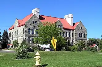 The finished building featured a tin mansard roof (molded and painted to look like tile), gables, and an attic suspended from the roof joists.[10] The interior woodwork was solid oak, all rooms had 3-foot (0.91 m) high wainscoting, the solid doors were 2.5 inches (6.4 cm) thick, and highly detailed molded pediments were emplaced over each door.[10] Ornate brass doorknobs and hinges were used throughout the building, and heat was supplied by cast iron radiators with delicate, filigreed covers.[10] The building (whose original cost was estimated at $59,940) was completed by McKay Brothers in 1896 at a total cost of $110,000.[9][10] The structure, which was designed to educate 500 students, contained 14 classrooms, a physical laboratory, a chemical laboratory, an art studio, and an assembly hall that could seat 400.[9] A boiler system was installed in the basement.[10]