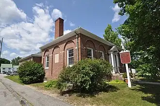 The library is located in a brick building at the northeast corner of Church and Main Streets in South Paris, which is now designated Market Square. It is one story in height, five bays wide and three deep, and has a hip roof. The bays are characterized by recessed arched openings, most of which have sash windows in their centers. The central bay facing Church Street has no window, and is solid brick except for a terra cotta panel, and the central bay on the front facade has the main entrance, which is approached by a small flight of stairs with iron railings. It is sheltered by a gabled portico supported by thin Tuscan columns. The interior has two reading areas, each with a fireplace, a stack area, librarian's desk, and office. The basement, originally used for storage, was partially finished in 1962 to provide office spaces.[2] A modern addition greatly expands the size of the building to the rear.