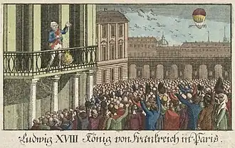 Louis XVIII returned to the city on 8 July 1815, and moved into the old rooms of Napoleon at the Tuileries Palace.[3] He was greeted with songs and dances by the royalists of the city, but indifference or hostility by the rest of the Parisians. The pre-revolutionary names and institutions were quickly restored; The Pont de la Concorde became the Pont Louis XVI, a new statue of Henry IV was put back on the empty pedestal next to the Pont Neuf, and the white flag of the Bourbons flew from the top of the column in Place Vendôme.[4]