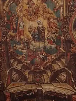 The painting of the ceiling of the vaulted nave is of oil on wood. The painting is 2,600 centimetres (1,000 in) long, 1,200 centimetres (470 in) wide, and has a height of 250 centimetres (98 in). The center of the painting has a large image of the Holy Family in a stylized medallion.[5]