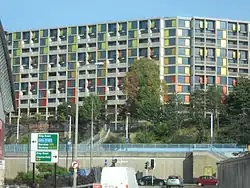 Park Hill is a housing estate in Sheffield, South Yorkshire, England. It was built between 1957 and 1961, and in 1998 was given Grade II* listed building status.[1] Following a period of decline, the estate is being renovated by developers Urban Splash into a mostly private mixed-tenure estate made up of homes for market rent, private sale, shared ownership, and student housing while around a quarter of the units in the development will be social housing.[2][3][4] The renovation was shortlisted for both the 2013 and 2024 RIBA Stirling Prize, for the first and second phases of the redevelopment respectively. The Estate falls within the Manor Castle ward of the City. Park Hill is also the name of the area in which the flats are sited. The name relates to the deer park attached to Sheffield Manor Lodge, the remnant of which is now known as Norfolk Park.