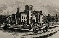 The oldest portion of the hotel was a recitation hall and dormitory building constructed for Capital University in 1853, which had moved there from East Town Street. The move was prompted by Lincoln Goodale, president of the university board, donating the four acres of land in 1852. The cornerstone was laid on June 30, 1852, and it was completed in the fall of 1853. The new building was dedicated by numerous Lutheran church leaders and the later U.S. Secretary of State William H. Seward. After about 20 years of operations here, the school moved to the suburb of Bexley in 1873, and fully vacated the building in 1876.[1][3]