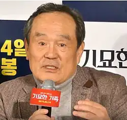After his discharge, he joined the Gagyo theater troupe[4][5] in January 1969, beginning his professional acting career. He performed in over 100 plays, including Foolish Fortune-telling, The Traveling Theater Troupe, and Good People.[6] His stage work earned him critical acclaim, including the Best Acting Award at the 1978 Republic of Korea Theater Festival, the Dong-A Theater Award for Best Male Acting in 1981, and the Baeksang Arts Award for Best Male Acting in 1984. He also served as the head of Gagyo for two terms (1979-1984 and 1985-1991).[3]
